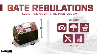 - Bring your own food and beverages to the Speedway. Coolers smaller than 18" x 15" x 15" are welcome as long as they don't contain glass. You can find cooler and gate regulations here.
